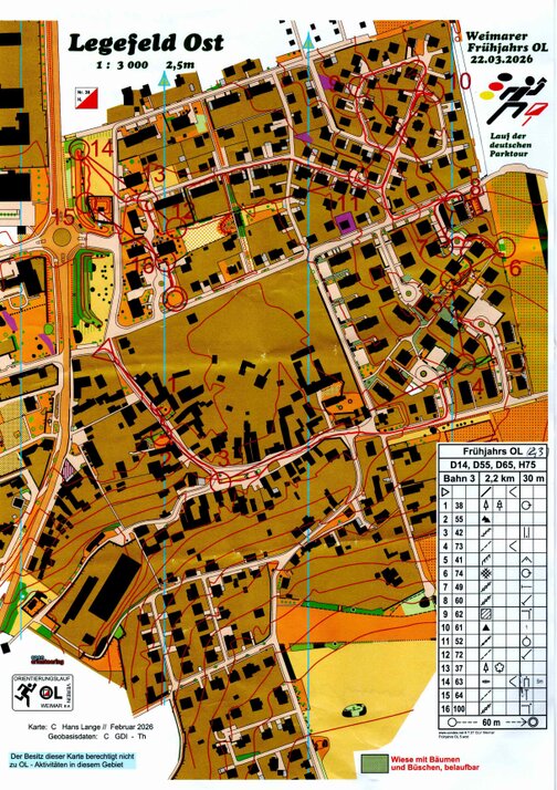 Leider war der SV Schmalkalden 04 mit nur einer Starterin beteiligt. Das Wettkampfzentrum befand sich im Vereinshaus Legefeld im Ortsteil von Weimar. Das Gelände war ein leicht bergiges, urbanes Siedlungsgelände mit geringen Wiesenanteil. In der Klasse Damen 65-74 startete die Schmalkalderin Constanze Rathmann. Ihre Laufstrecke betrug 2,2 km mit 16 Kontrollposten, die vorwiegend an Bäumen, Haus-, Mauer- und Zaunecken standen. Beim Sprint sind schnelle Routenwahlentscheidungen zu treffen. Konzentration bis zum Schluss war gefordert, denn man sah unterwegs viele Posten von anderen Klassen und man durfte sich durch diese nicht ablenken lassen. Constanze machte keine Fehler und erreichte nach 18:12 min das Ziel. Mit einem Vorsprung von 32 sec. belegte sie den 1.Platz unter 6 Konkurrentinnen. Damit erkämpfte sie den Titel Thüringenmeister und gleichzeitig Punkte für die Deutsche Parktour 2026.